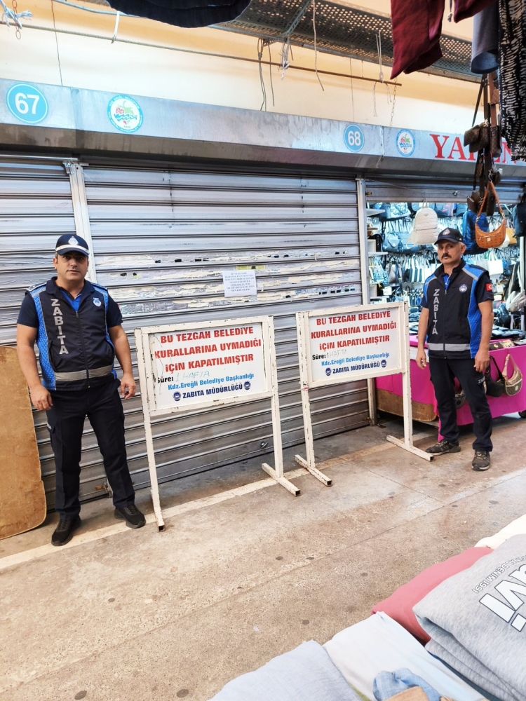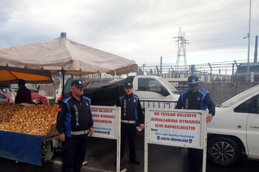 Kdz. Ereğli Belediyesi Zabıta Müdürlüğü ekipleri gelen şikayetler üzerine pazar yerinde müşteriye kaba davranan 2 tezgaha cezai işlem uygulayarak 1 hafta süreyle kapattı.