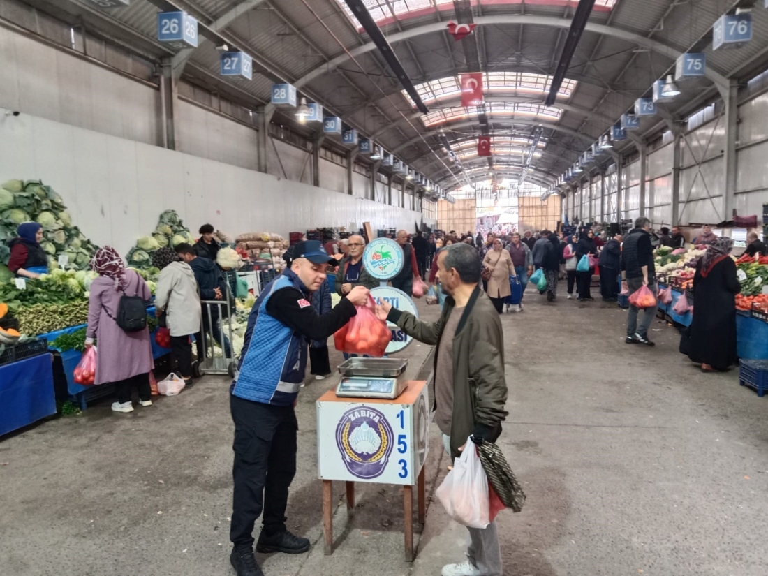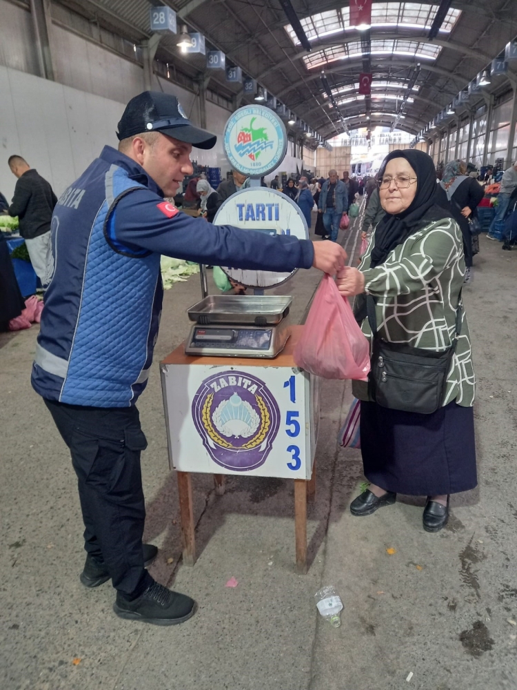 Kdz. Ereğli Belediyesi Zabıta Müdürlüğü ekipleri, pazaryerinde vatandaşların alışverişlerini güven içinde yapabilmesi için denetimlerini sürdürüyor. Ekipler, hem pazarcı esnafının fiyat ve etiket kurallarına uyup uymadığını kontrol ediyor hem de vatandaşların poşetlerine koyulan ürünleri tartarak olası hileli satışların önüne geçiyor.