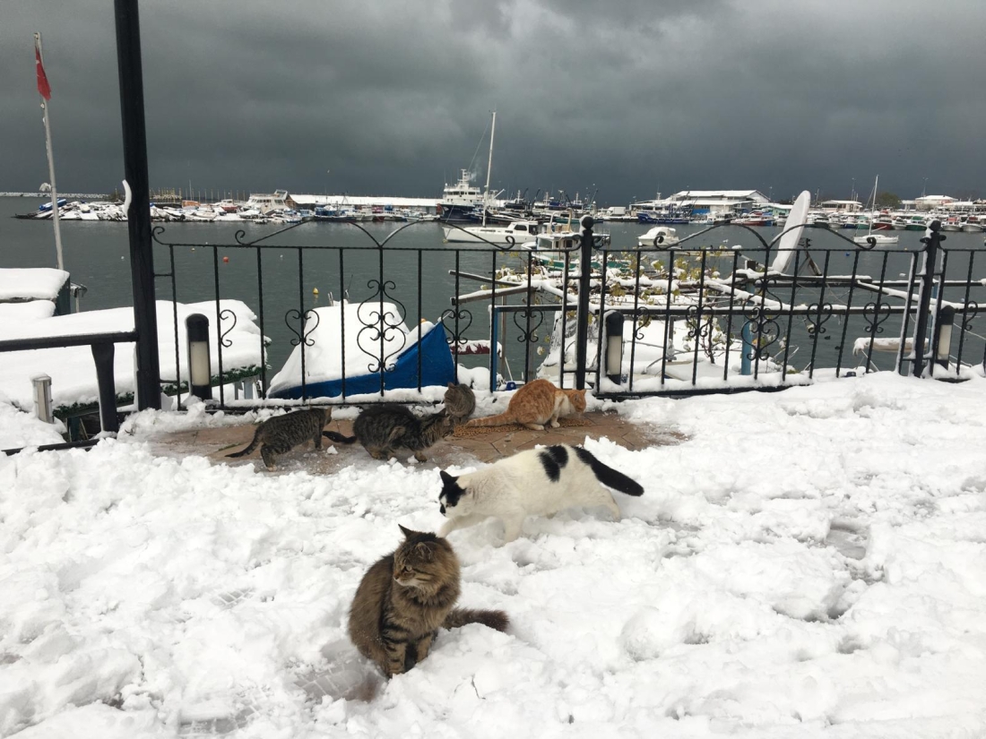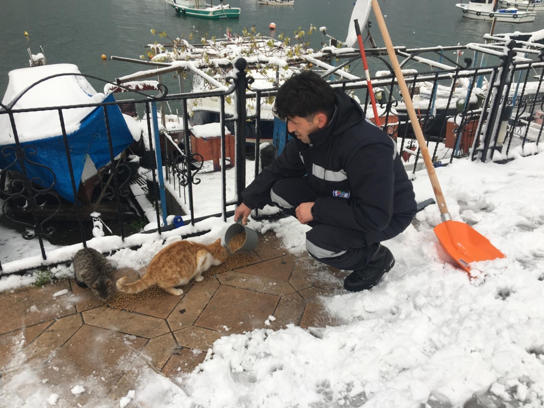 Kdz. Ereğli'de yeni yılın ilk günü kar yağışı ve soğuk hava etkisini sürdürürken Belediye Veteriner İşleri Müdürlüğü sokaktaki canları unutmadı.