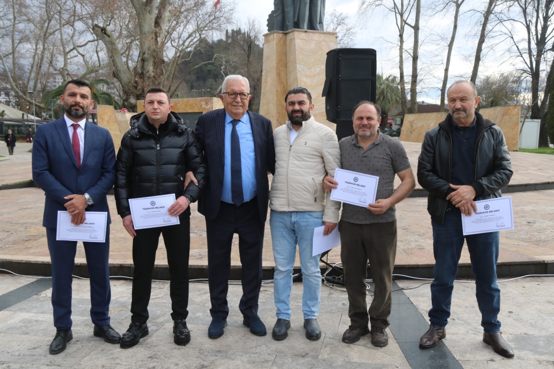 Başkan Posbıyık, konuşmasının ardından depremden sonra Ereğli halkının yardımlarını bölgeye ulaştıran kişi ve kuruluşlara teşekkür belgesi takdim etti. Başkan Posbıyık, S.S. Erbirlik Karayolu Yük Taşıma Kooperatifi Başkanı Seçkin Turhan, Nurullah Özdemir, Yılmaz Cömert, Hakan Ulu, Ömer Demir, Abdullah Danışmaz, Ahmet Korkmaz, Yılmaz Kardeşler, Sedat Sarcan, Yunus Korkmaz, Erol Yılmaz, Fırat Kezgin, Tolga Uzunçakmak ve Ufuk Kızıl’a teşekkür etti.