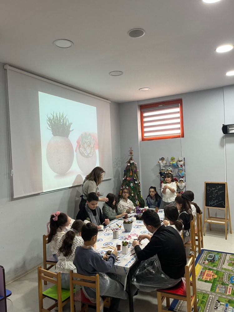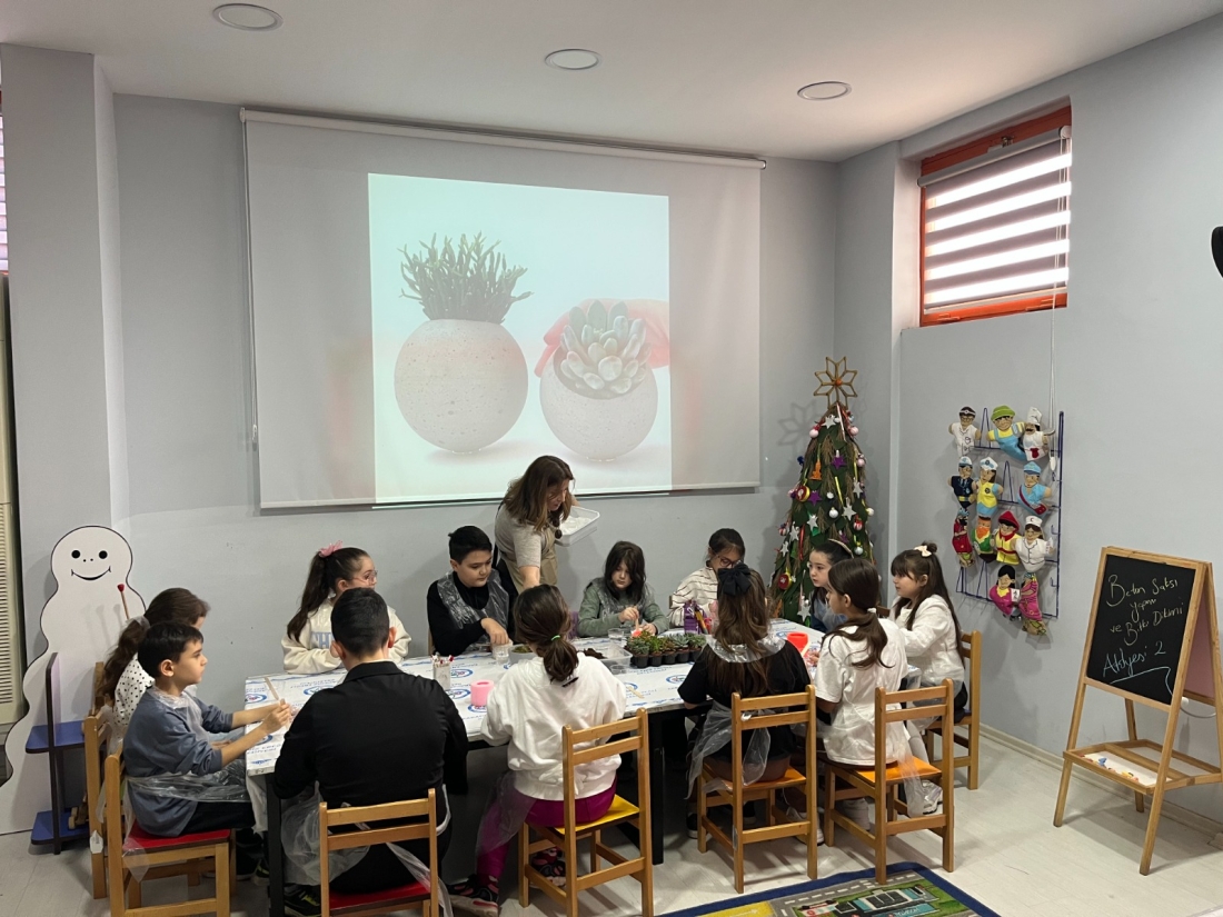 Çocukların el–göz koordinasyonunun gelişmesine, yaratıcılıklarının ve tasarım odaklı düşünme becerilerinin desteklenmesine katkı sağlayan atölye, bu kez de renkli ve keyifli anlara sahne oldu. Katılımcılar, atölye lideri İnşaat Mühendisi Elif Koç tarafından kullanılacak malzemeler hakkında bilgilendirildi; beton saksının hazırlanışı, döküm süreci, kalıptan çıkarılması ve toprak ile süsleme malzemeleriyle bitki dikimine kadar tüm aşamaları uygulamalı olarak öğrenme fırsatı buldu.
