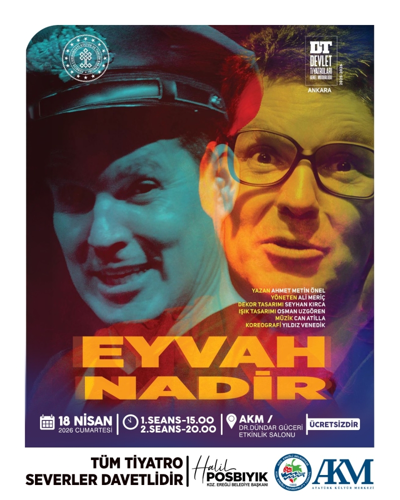 Kdz. Ereğli Belediyesi ev sahipliğinde, bu hafta sonu Ankara Devlet Tiyatrosu sanatçıları tarafından iki seans sahnelenmesi planlanan “Eyvah Nadir” isimli tek perdelik komedi oyunu, Kültür ve Turizm Bakanlığı Devlet Tiyatroları Genel Müdürlüğü tarafından, son günlerde Şanlıurfa ve Kahramanmaraş illerinde meydana gelen ve kamuoyunu deriden etkileyen üzücü olaylar nedeniyle iptal edildi.