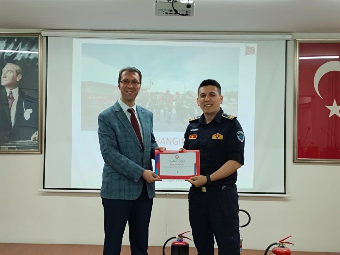 Turizm Fakültesi Dekanı Prof. Dr. Avni Yıldız, eğitimi veren İtfaiye Amiri Burak Demirören’e teşekkür belgesi takdim etti.